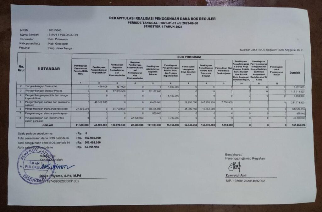 REKAPITULASI REALISASI PENGGUNAAN DANA BOS JANUARI JUNI 2023 REKAPITULASI REALISASI PENGGUNAAN DANA BOS JANUARI JUNI 2023 SMAN 1 PULOKULON