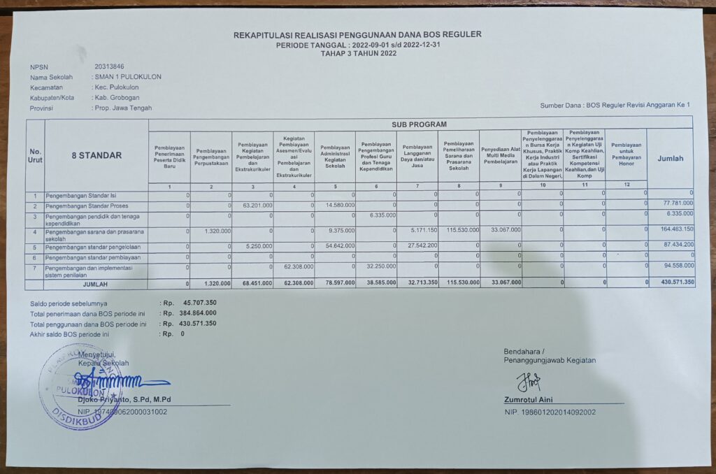 REKAPITULASI REALISASI PENGGUNAAN DANA BOS REGULER TAHAP 3 TAHUN 2022 REKAPITULASI REALISASI PENGGUNAAN DANA BOS REGULER TAHAP 3 TAHUN 2022 SMAN 1 PULOKULON